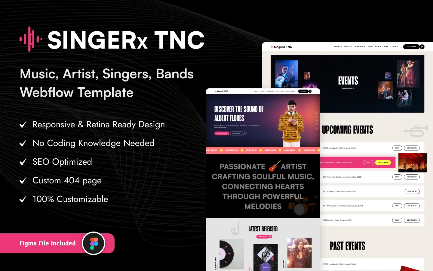 Suitable For: SingerX TNC is specially designed for all musicians, singers, and artists. Showcase your band with three different home pages, highlight your music, albums, or videos, and sell merchandise or more developed with Webflow.
