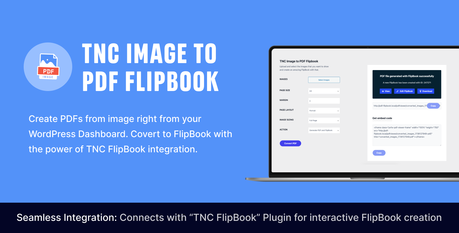 TNC Image to PDF FlipBook lets you turn multiple images into a single PDF and then into an interactive flipbook with just a few clicks. You can upload your images, arrange the order, and generate a high‑quality PDF. Use TNC FlipBook to show it off on your site with smooth page-flip effects.