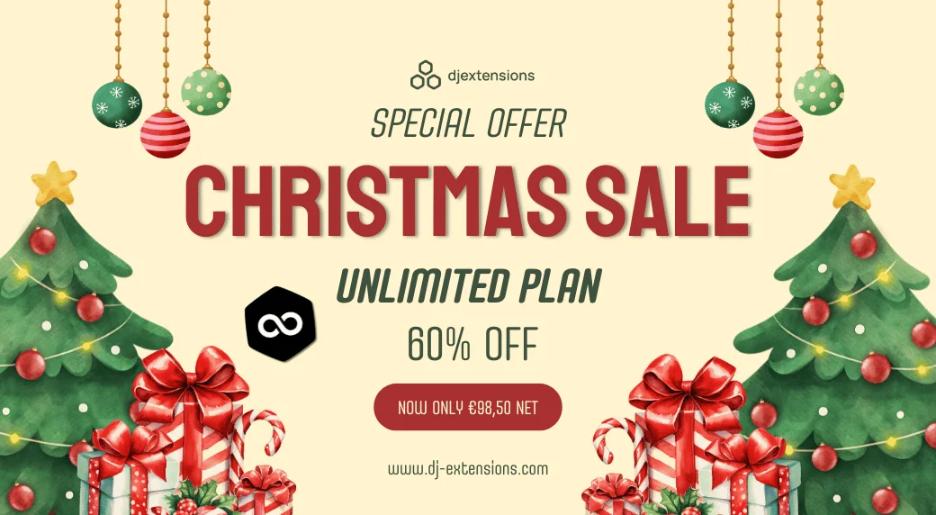 Get into the festive spirit with DJ-Extensions, the most significant sale of the year! Enjoy an incredible 60% off on all Joomla and WordPress products, including templates, plugins, themes, extensions, and the Unlimited Plan. Upgrade your website with premium solutions at unbeatable prices!