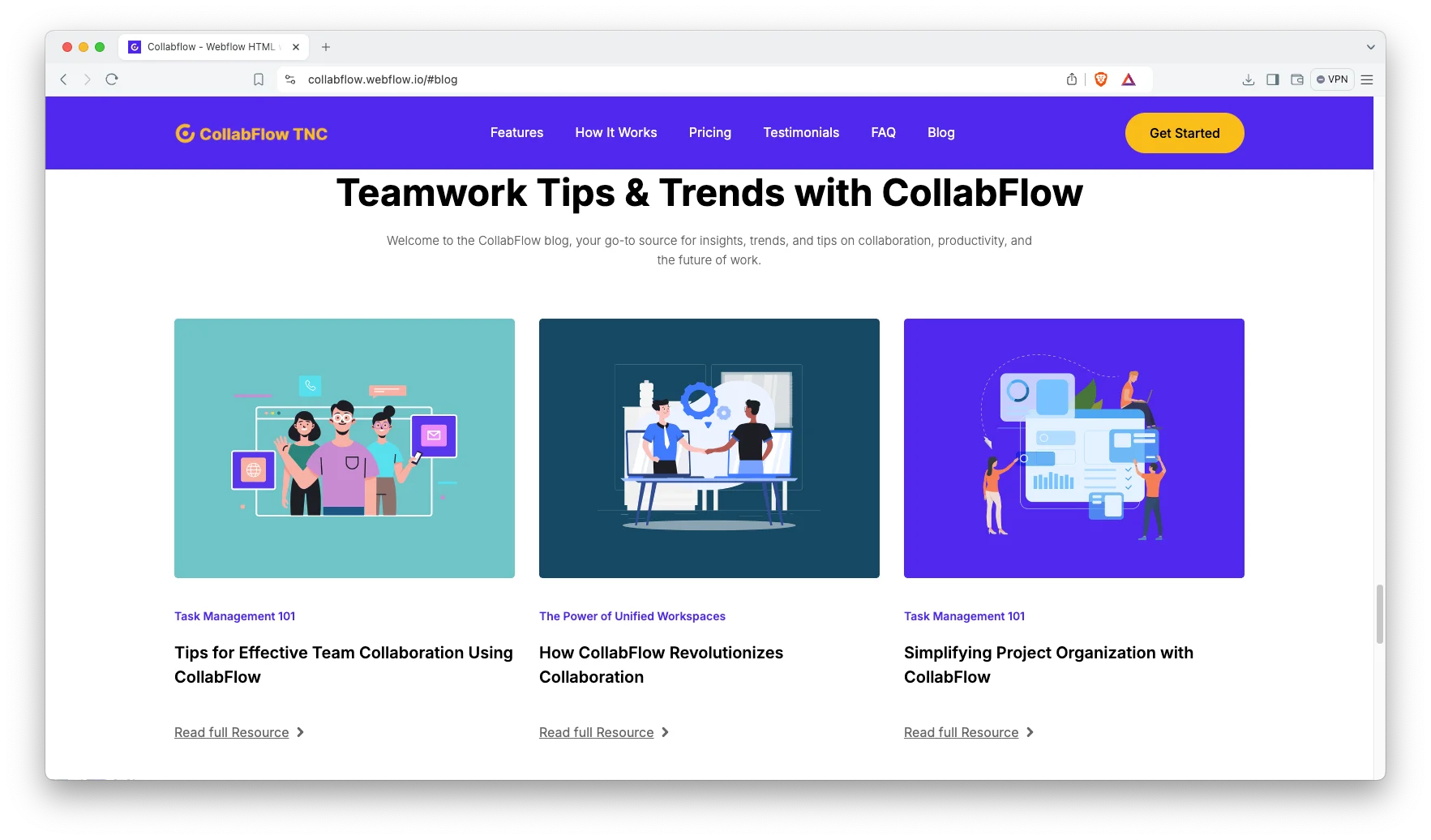 Powerful CMS: CollabFlow TNC is built using Webflow CMS functionality. This template lets you publish informative blog posts, news, and testimonials with powerful CMS integration.