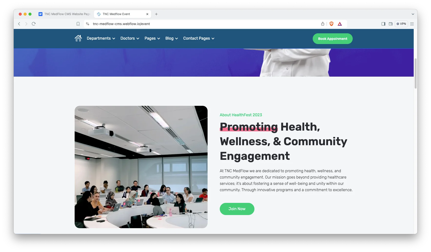 Perfectly Designed Event Page: Announce your upcoming event with TNC MedFlow CMS. Our template makes it easy to host a free seminar, join new doctors, get free treatment, etc. Promote your event and connect with your audience.
